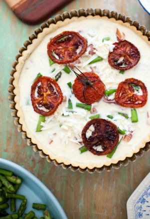 Roasted Tomato Asparagus Quiche with Cheddar